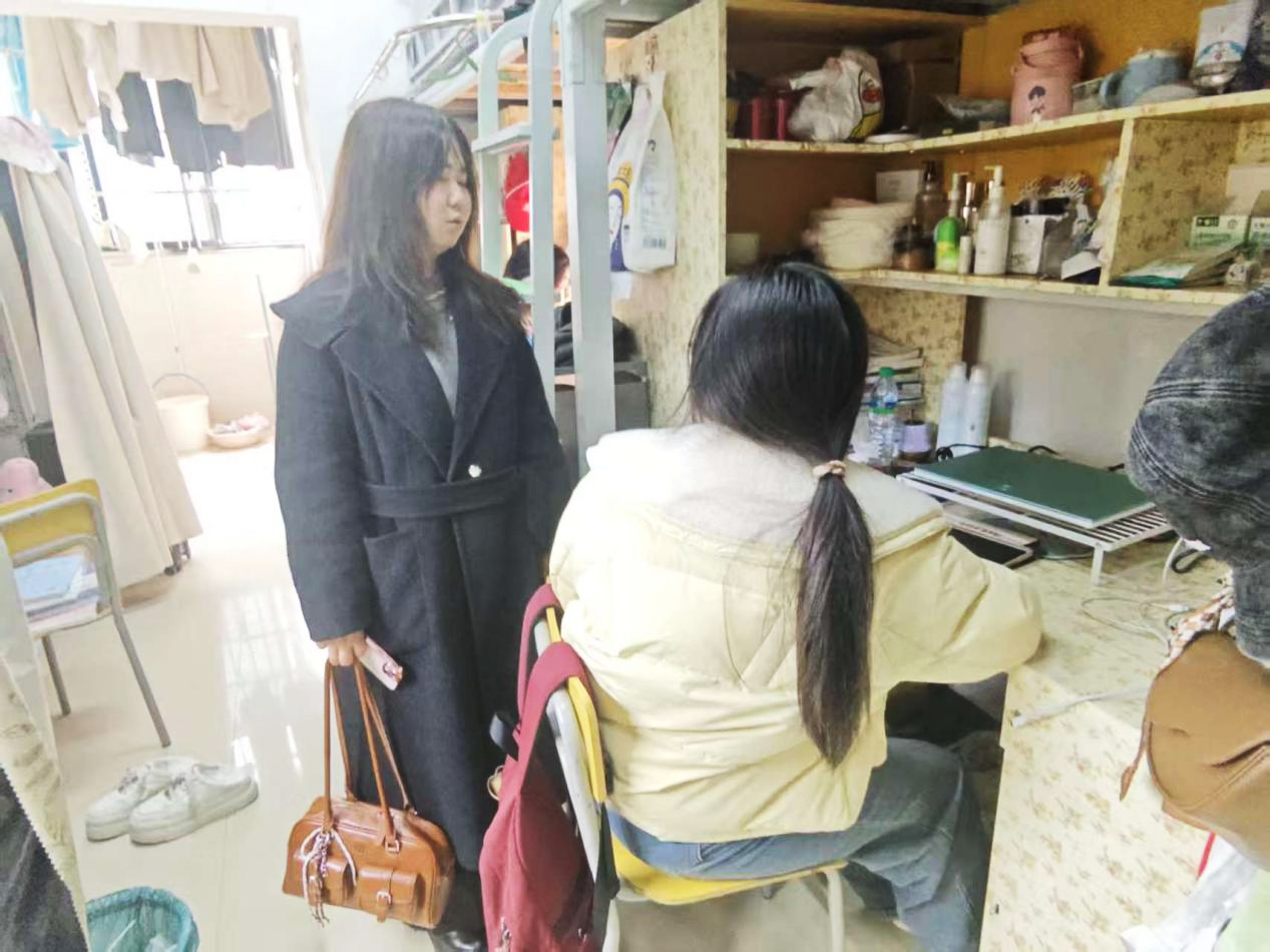 袁园一行重点围绕宿舍卫生状况、用电安全、消防隐患等方面进行了细致检查。在走访过程中,与同学们亲切交流,详细了解同学们的思想动态与学习生活情况,叮嘱同学们要增强安全意识,严格遵守宿舍管理规定,共同维护良好的生活环境。